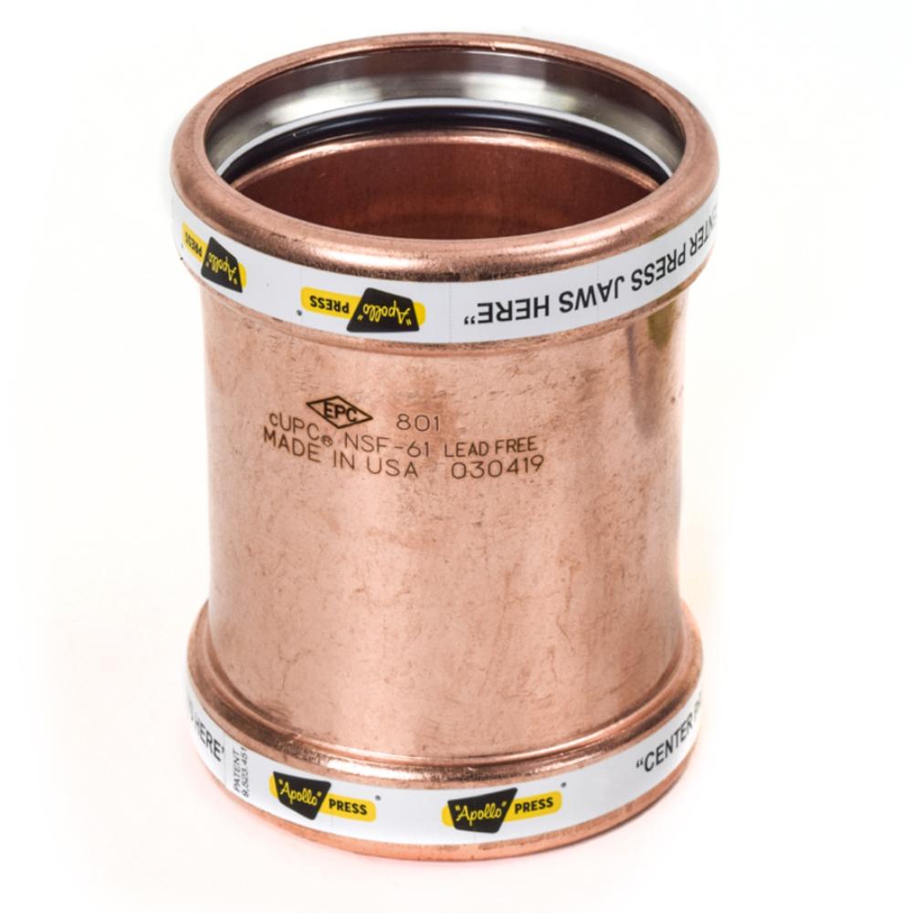 This press slip coupling (no internal stop) connects two 4" copper pipes together in a straight line.
