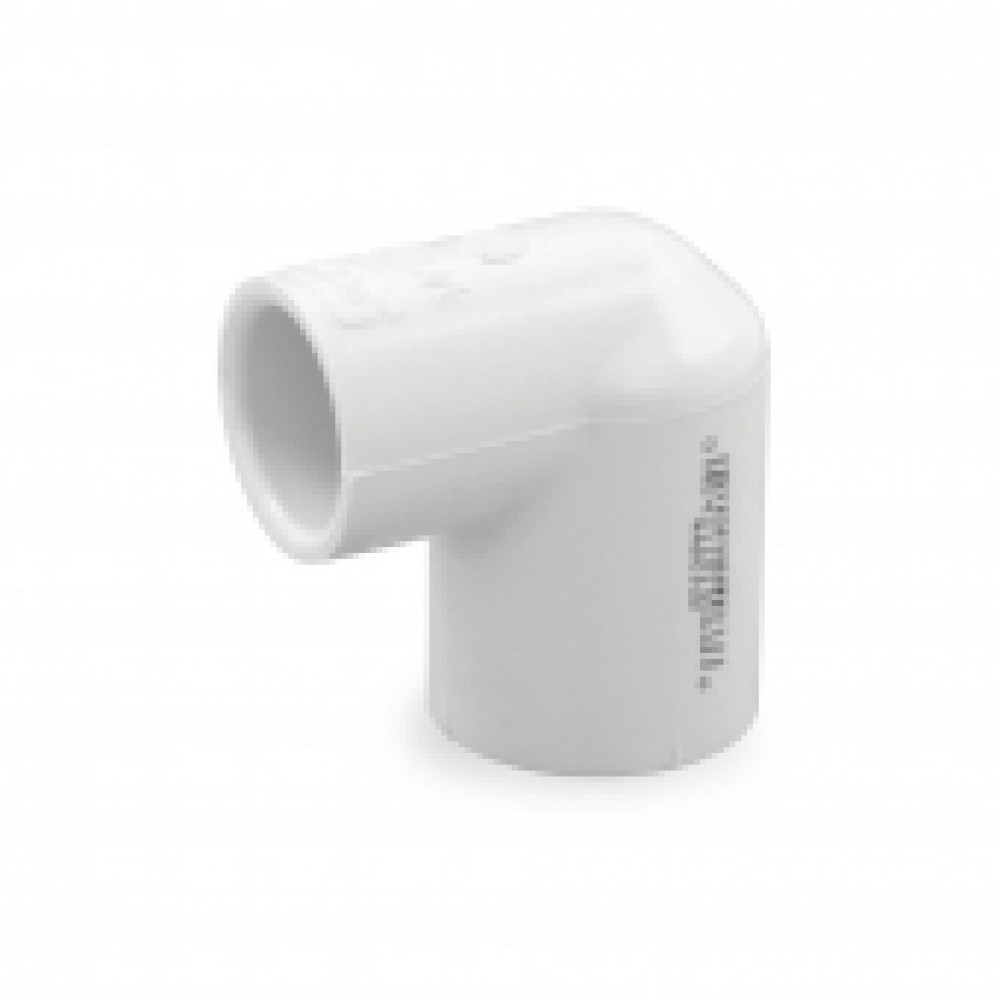 This schedule 40, 90-degree elbow fitting is used to connect two 3/4" and 1/2" PVC pipes together at a 90-degree angle. Socket (hub) connections on both outlets.