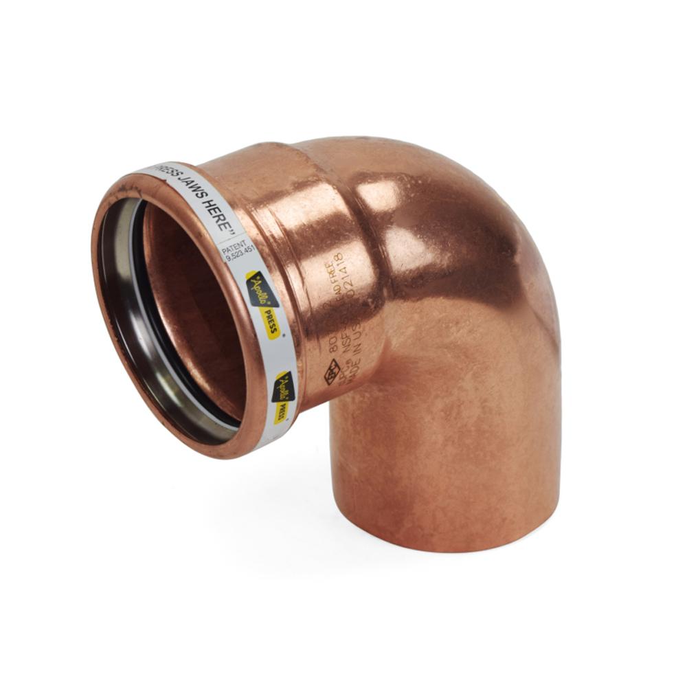 This close turn press elbow fitting connects 3" copper pipe to 3" press fitting outlet at a 90-degree angle.