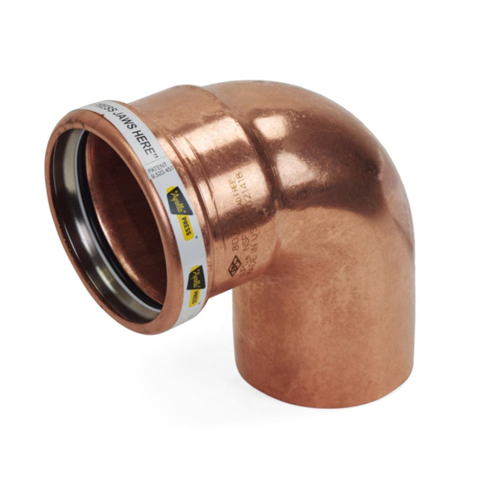 This close turn press elbow fitting connects 4" copper pipe to 4" press fitting outlet at a 90-degree angle.