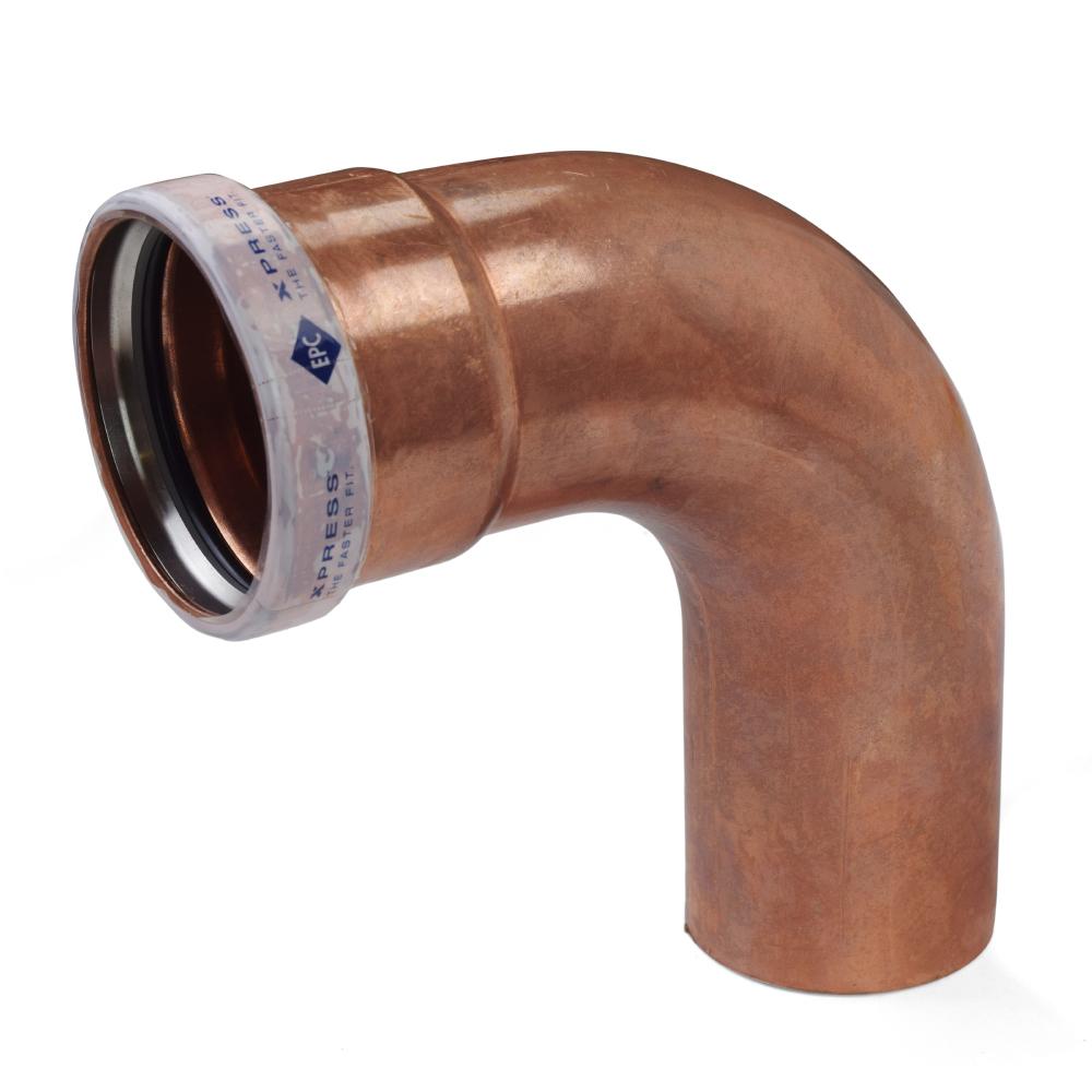 This long turn press elbow fitting connects 4" copper pipe to 4" press fitting outlet at a 90-degree angle.