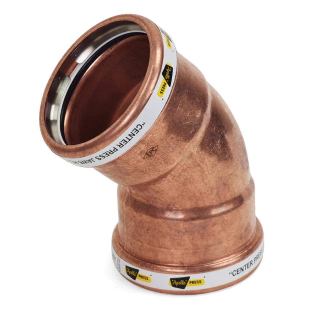 This press elbow fitting connects two 4" copper pipes together at a 45-degree angle.