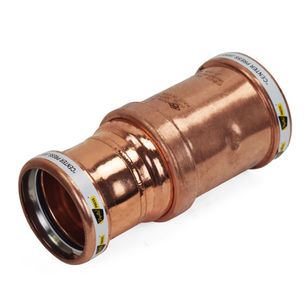This press coupling fitting (with internal stop) connects 2-1/2" to 2" copper pipes together in a straight line.