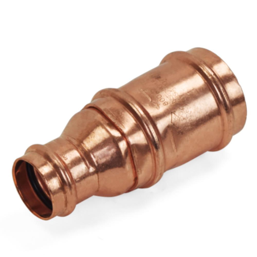 This press coupling fitting (with internal stop) connects 2" to 1-1/4" copper pipes together in a straight line.