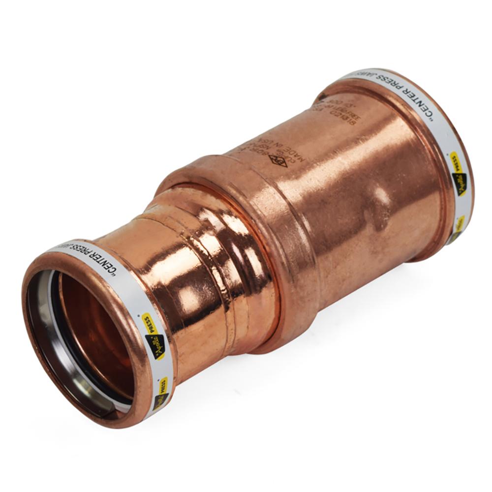 This press coupling fitting (with internal stop) connects 3" to 2" copper pipes together in a straight line.
