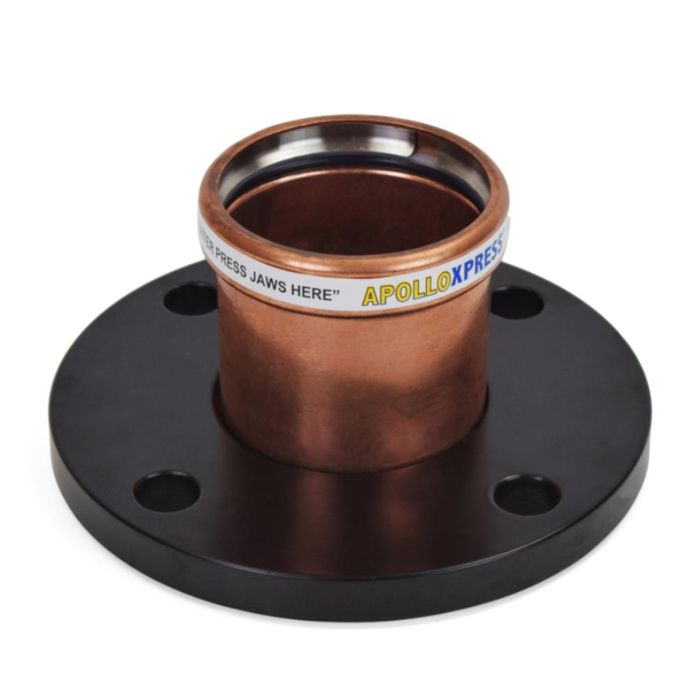 This press flange adapter connects 4" copper pipe to a flange.