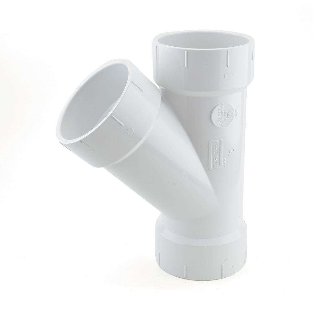 The P600-030 from Spears is a 3” PVC DWV Wye. It connects a 3" PVC branch line into a 3" PVC main horizontal drain line. Socket (hub) connections on all outlets.
