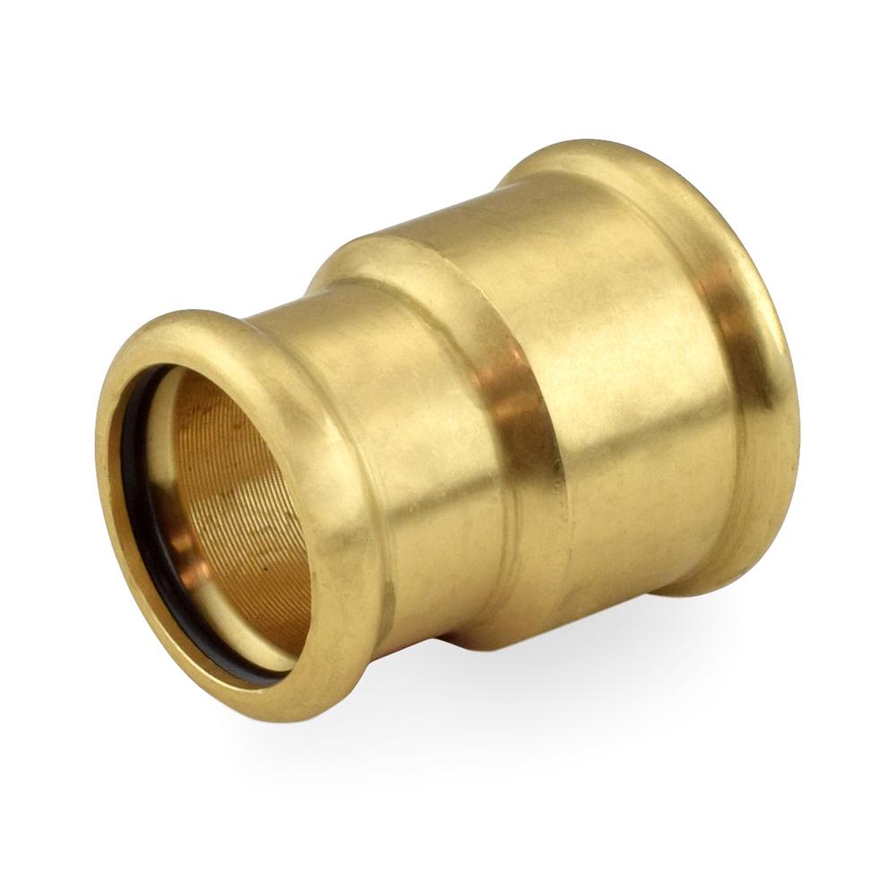 This press coupling fitting (with internal stop) connects 1-1/4" to 1" copper pipes together in a straight line.