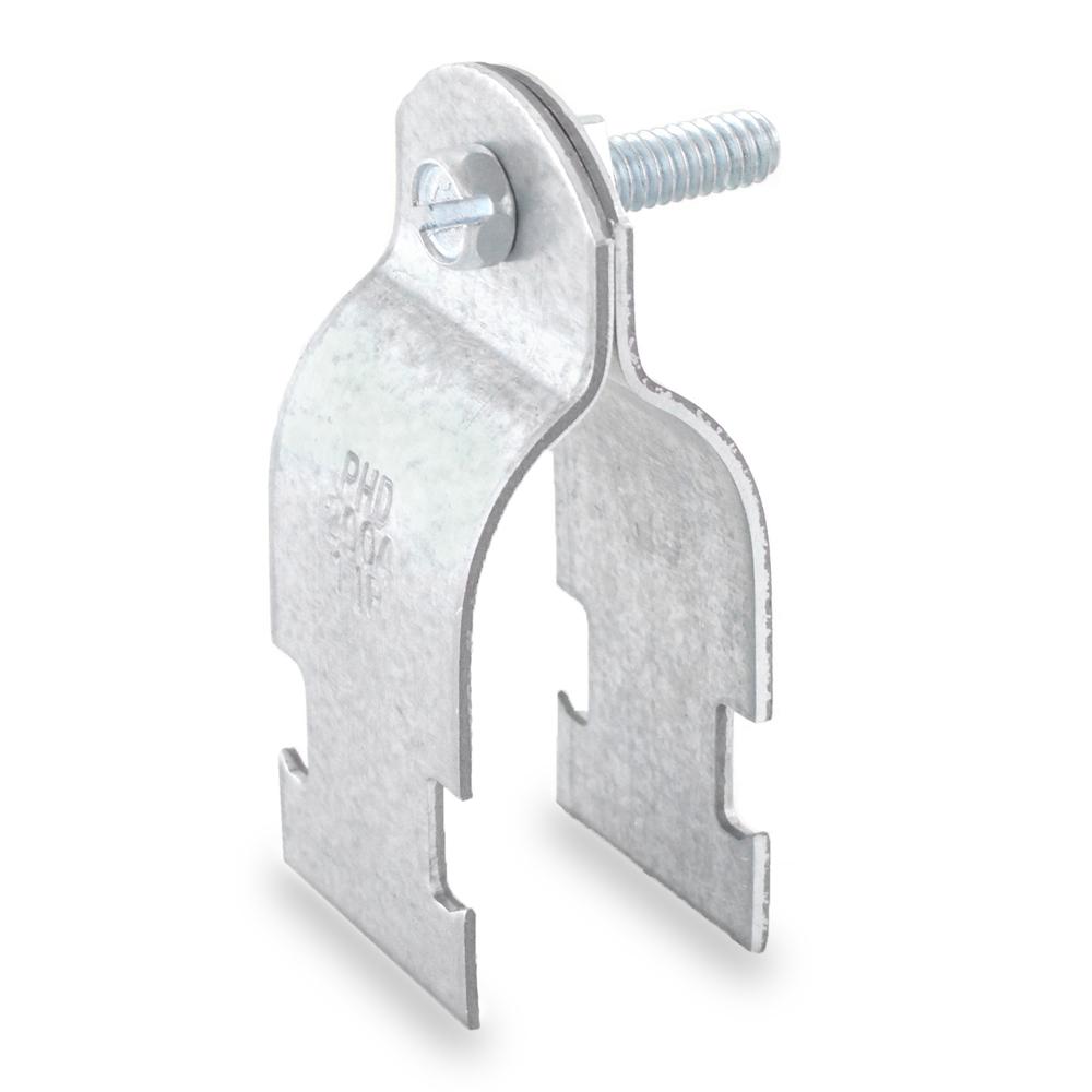 The 2004-100-EG from PHD is a 1” Galvanized Strut Clamp. It secures 1" pipe (black, galvanized, Sch 40 PVC) to a standard strut channel for horizontal or vertical support.