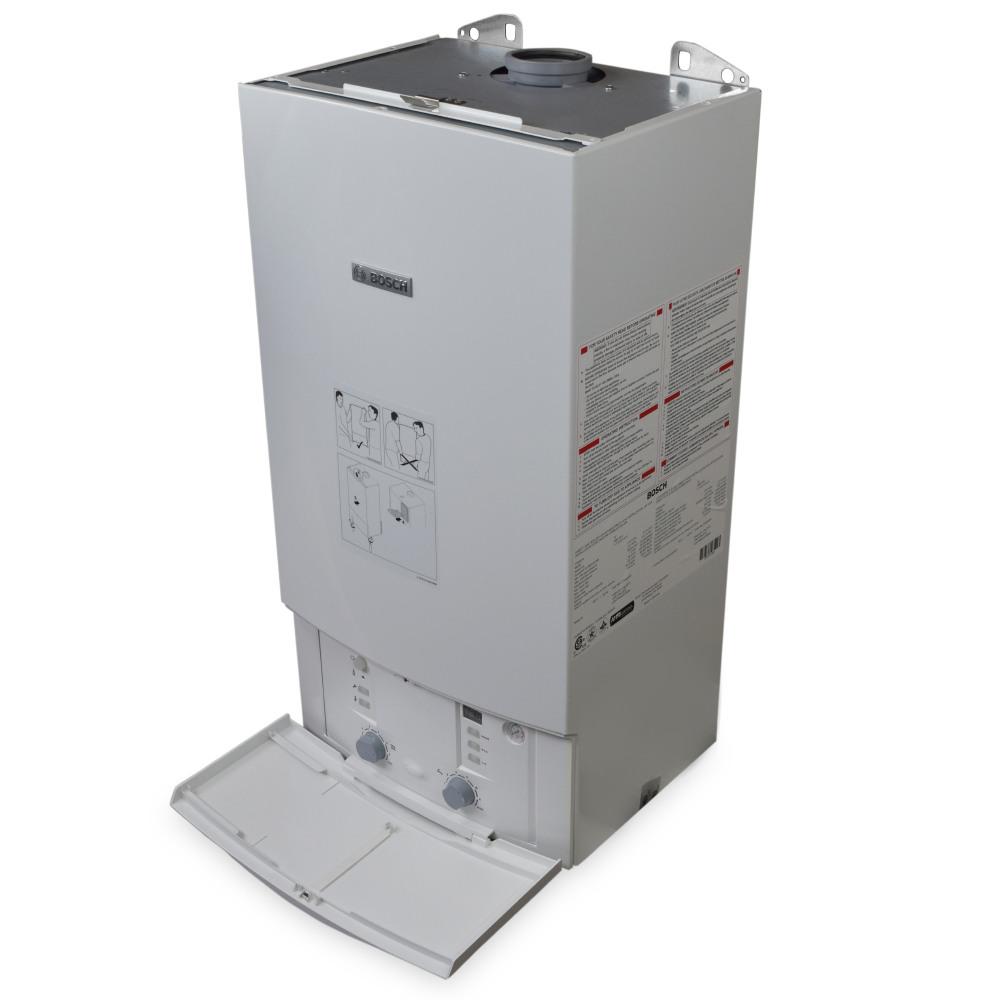 Bosch Greenstar series, 100-ZBR28 model, wall-mounted heat-only gas condensing boiler with 79,000 kBTU (Net) rating. Energy Star rated. Includes built-in pump, LPG conversion kit, 3" twin pipe adapter and outdoor reset control.