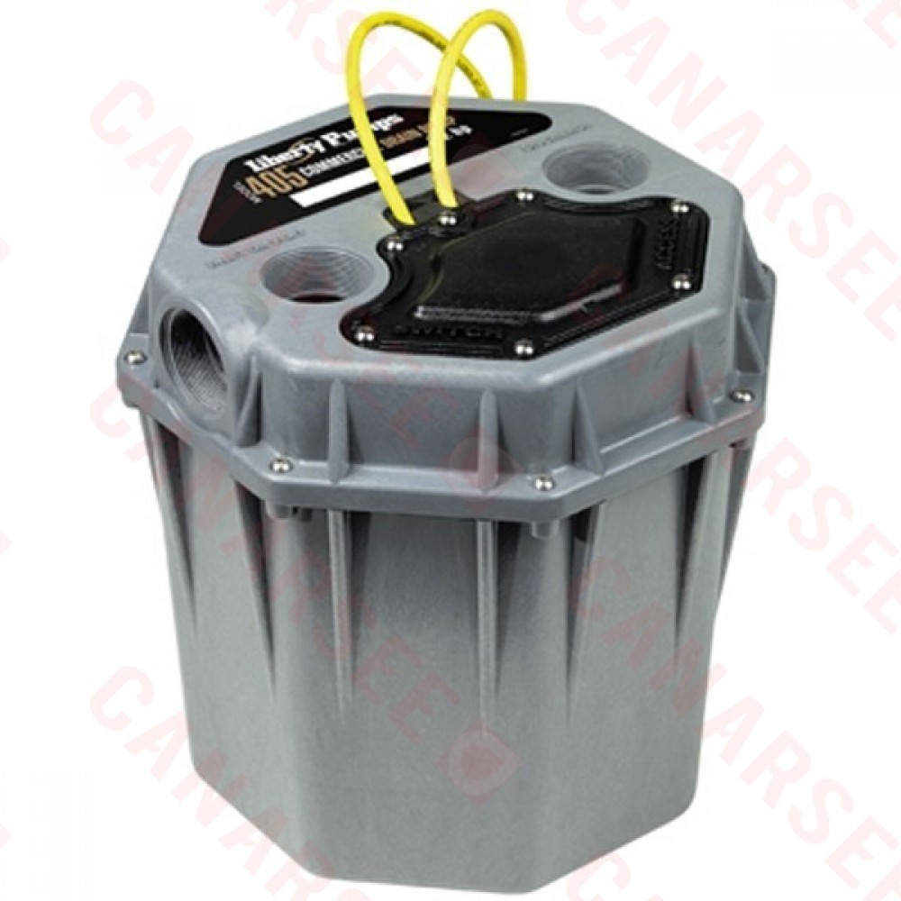 The 405 from Liberty Pumps is an Automatic Commercial High-Head, High Temp (180F) Drain Pump w/ 5.5 gal Basin, 2” Connections, 10' cord, 1/2HP, 115V. The Liberty Pump 405 commercial high-head drain pumps come equipped with a float switch that has a piggyback plug for temporary manual operation of the pump. This drain-pump has 2" connections and 3/8" solids-handling capabilities. The Liberty 405 Drain Pumps are specifically designed for higher head applications such as commercial and industrial buildings, where higher temperature drain water (up to 180°F.) may be used. These drain pumps are applicable to bar sinks, laundry trays, dehumidifiers, utility sinks and gray wastewater drainage below gravity lines.