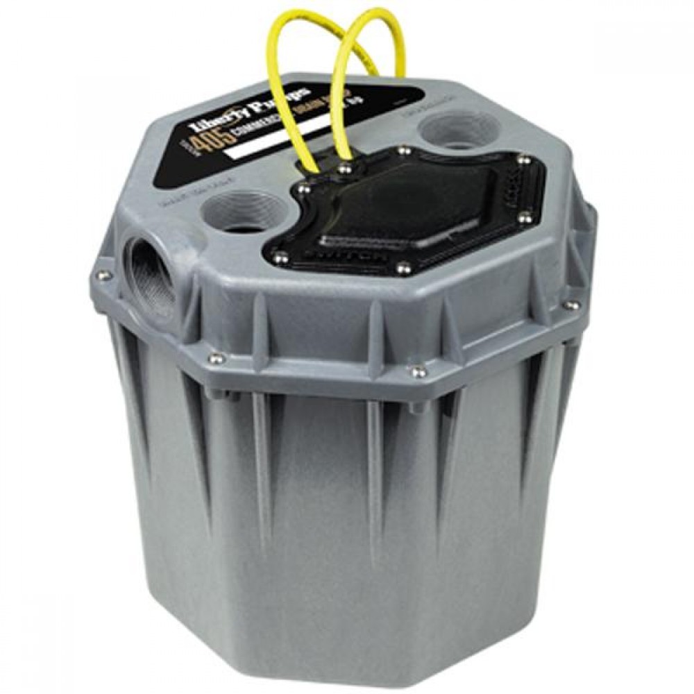 The Liberty Pump 405 pre-assembled drain pump has a total basin capacity of 5.5 gallons. This drain pump also has a separate access cover for easy switch inspection. The Liberty 405 drain pump is not intended to be used with chemicals. Its oil-filled, hermetically sealed motor is equipped with thermal overload protection. 208-230V single phase commercial high head pumps should only be operated without the float switch by using the circuit breaker or panel-disconnect.