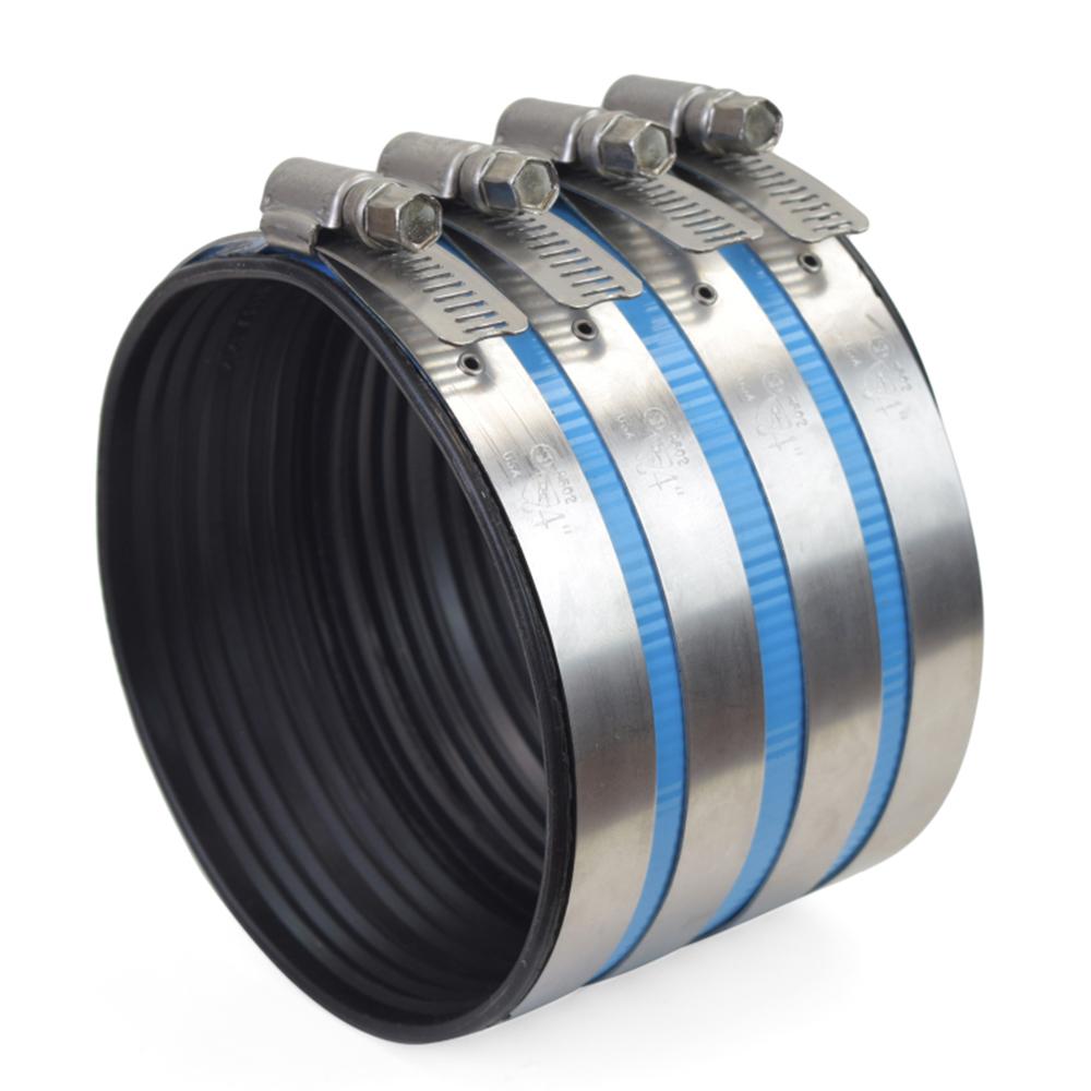 This Mission heavy-duty no-hub coupling connects two 4" no-hub cast iron pipes together in a straight line.