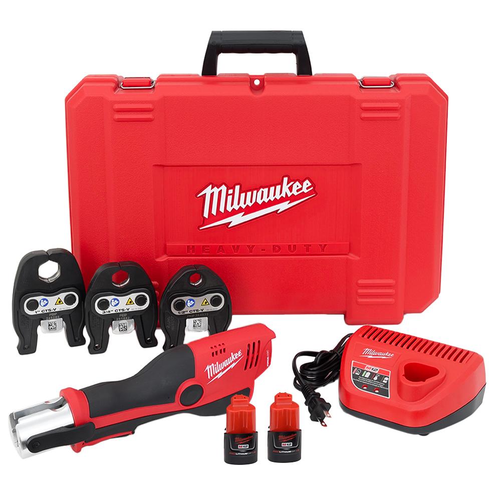 This kit includes: (1) M12 Force Logic Press Tool, (1) M12 1/2" Copper Press Jaw, (1) M12 3/4" Copper Press Jaw, (1) M12 1" Copper Press Jaw, (2) M12 RedLithium CP1.5 Batteries, (1) M12 Lithium-ion Battery Charger & (1) Carrying Case.