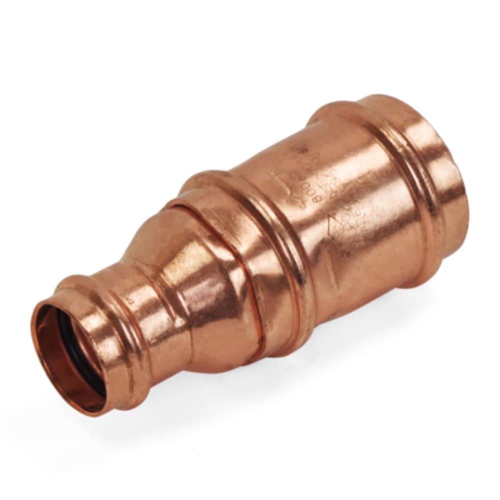 This press coupling fitting (with internal stop) connects 2" to 1" copper pipes together in a straight line.