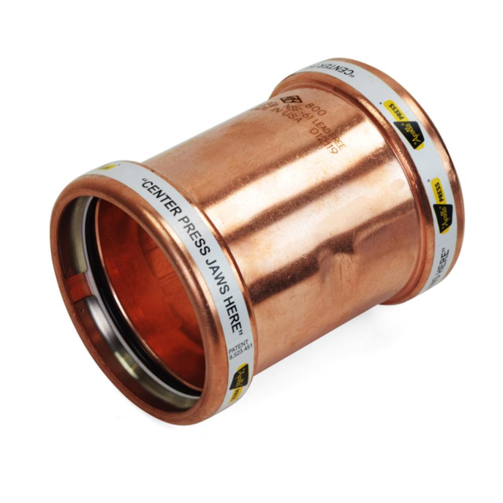 This press coupling fitting (with internal stop) connects two 4" copper pipes together in a straight line.