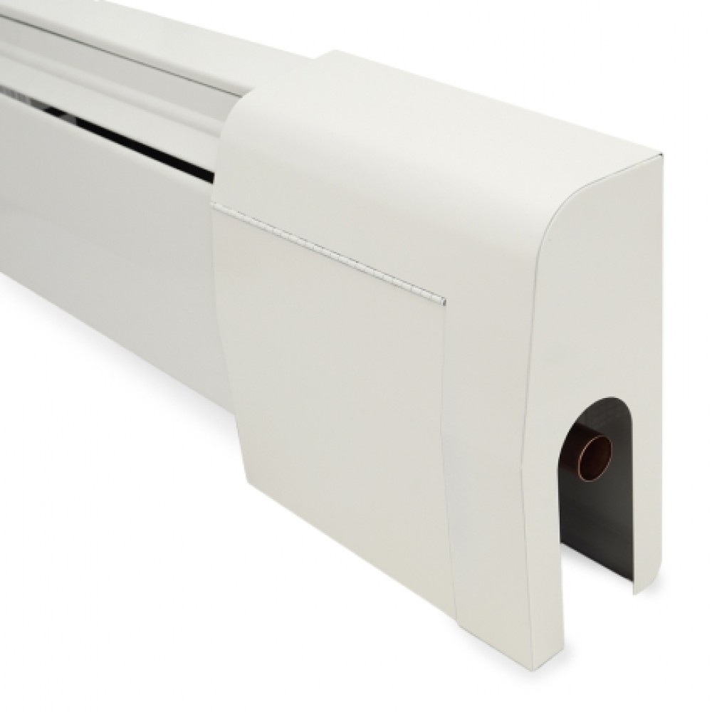 Extra-wide slotted hinged slip-on Right valve cover for Multi/Pak 88 baseboard by Slant/Fin - designed to provide convenient access to an air bleeder valve or a temperature regulating or shut-off valve. Allows to cover medium gaps between the baseboard and adjacent wall. Drawn steel design with rounded edges offers a better look and is safer than welded counterparts. White enamel finish.