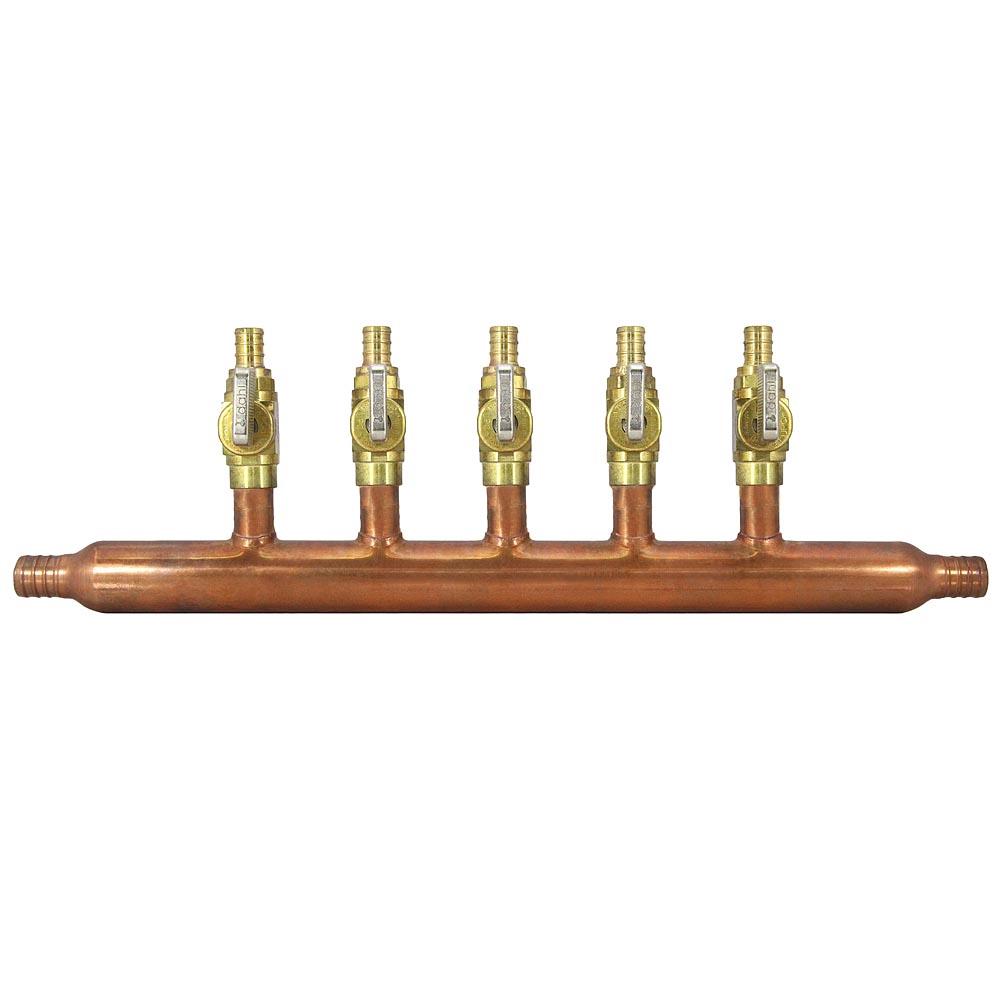 5-port Copper Manifold with 1/2" PEX Valves, 3/4" PEX x Open