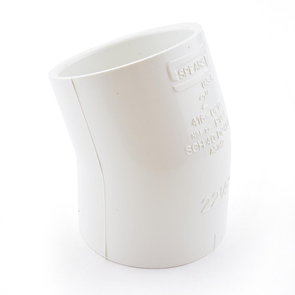 The 416-020 from Spears is a 2” PVC (Sch. 40) 22.5° Elbow. It's used to connect two 2" PVC pipes together at a 22.5-degree angle. Socket (hub) connections on both outlets.