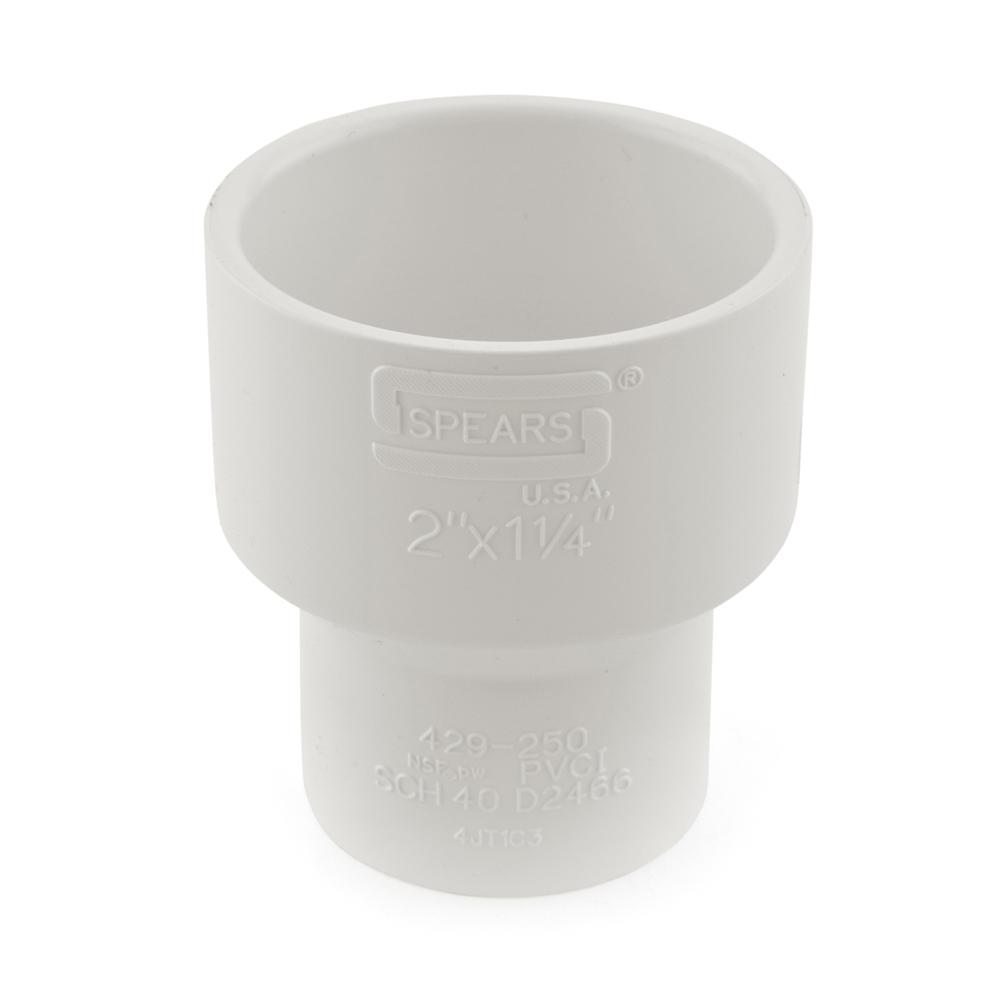 The 429-250 from Spears is a 2” x 1-1/4” PVC (Sch. 40) Reducing Coupling. It's used to connect 2” to 1-1/4” PVC pipes together in a straight line. Socket (hub) connections on both outlets.