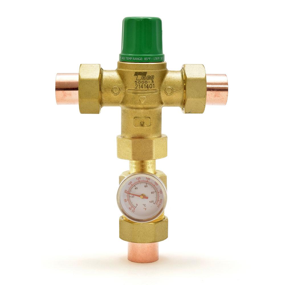 The 5003-C3-G from Taco is a 3/4” Union Sweat Mixing Valve w/ Temperature Gauge (Lead-Free), 85F-175F. It allows to mix domestic hot water at a temperature high enough to kill harmful bacterial but deliver it at a safe and comfortable temperature of 120°F or less. Temperature gauge to display output water temperature included.
