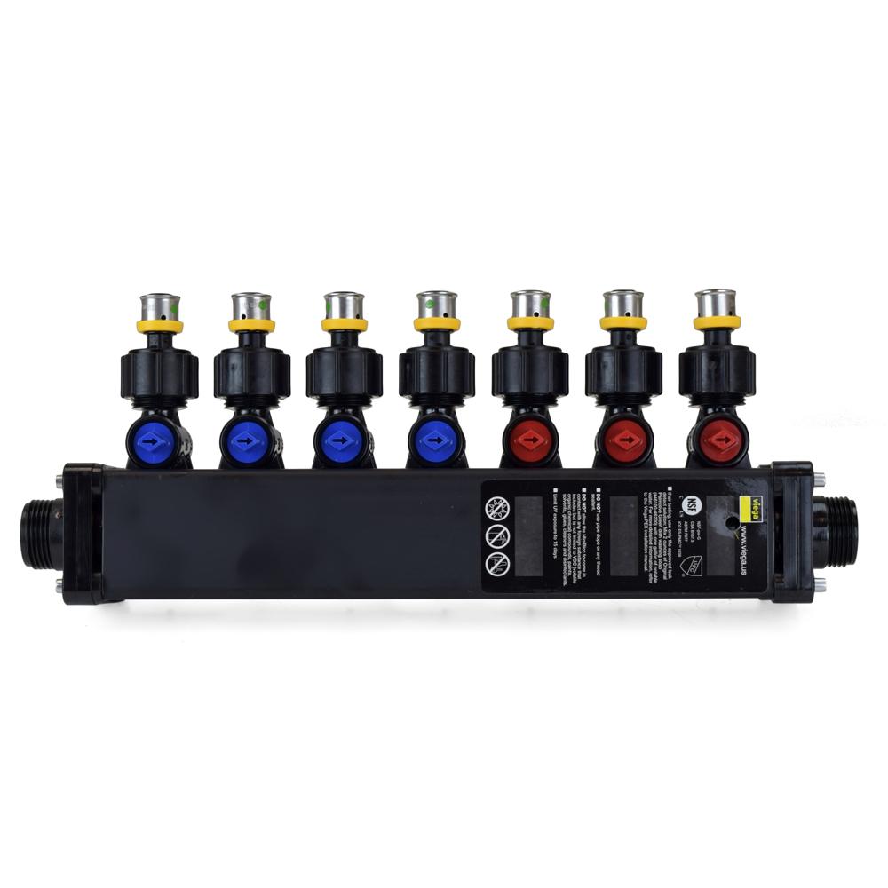 Viega MiniBloc manifold with (7) 1/2" PEX Press ports - (3) hot and (4) cold. Intended for use with ViegaPEX Ultra (Potable/Non-barrier) and Viega FostaPEX tubing and Press connection method. Also compatible with all other types (A, B, C) and brands of PEX tubing. Each port (branch) is equipped with a built-in 1/4 turn shut-off valve for individual fixture control. Includes PEX adapters for all ports (branches) and Valve Key.